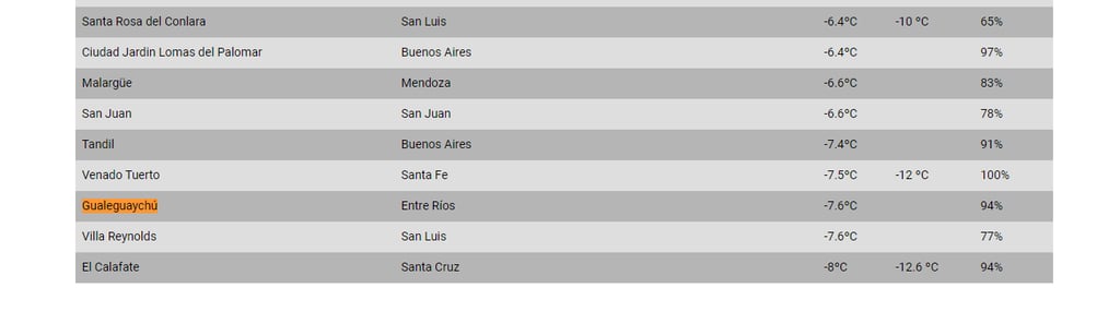 Así lo indicó el Servicio Meteorológico Nacional, que detectó los puntos del país en los que más frío hubo. En ese sentido, Gualeguaychú compartió el segundo lugar con Villa Reynolds, en San Luis, ciudades que sólo fueron superadas por El Calafate, Santa Cruz, que tuvo -8° C.